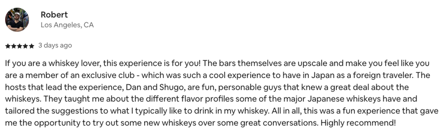 -About us- Koki, Dan, Yuichi, Yoshiki 4 of us are aged under 30 y.old who all HUGE Japanese whiskey lover, have a strong passion for guests enjoy REAL Japan & meeting new friends! If you could feel LOCAL Japan with us, it’s our greatest pleasure. *We're guiding people in Tokyo since 2018, Guided 3,000+ guests, 1000+ review total (Average☆4.97/5) so far!
